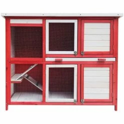 WILTEC Hasenstall Mit Zwei Ebenen & Treppe, Ausziehbarer Boden, Aus Holz, Rot-Weiß