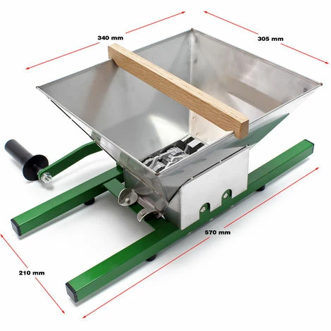 Dieser handbetriebene Obst- bzw. Gemüsehäcksler hat die Abmessung 57,5 x 48,5 x25,5 cm. Er ist sehr leicht zu reinigen und bereitet das Obst/ Gemüse für eine hohe Saftausbeute vor.