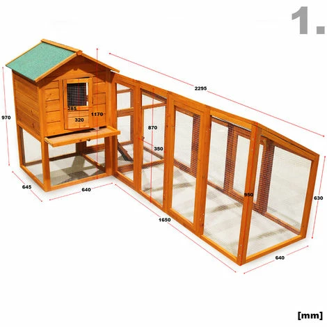 Die braun lasierte Holzkonstruktion bietet einen erhöhten Unterschlupf mit Nistplatz bzw. Eiablageplatz, in den die Tiere über eine rutschsichere Rampe gelangen. Das Dach ist ebenfalls aus Holz und bietet durch die Eindeckung mit Bitumen einen soliden Sonnen- und Regenschutz. Das Freilaufgehege ist mit engmaschigem Gitterdraht eingezäunt. So bekommen die Tiere ausreichend Frischluft und sind vor Raubtieren geschützt.