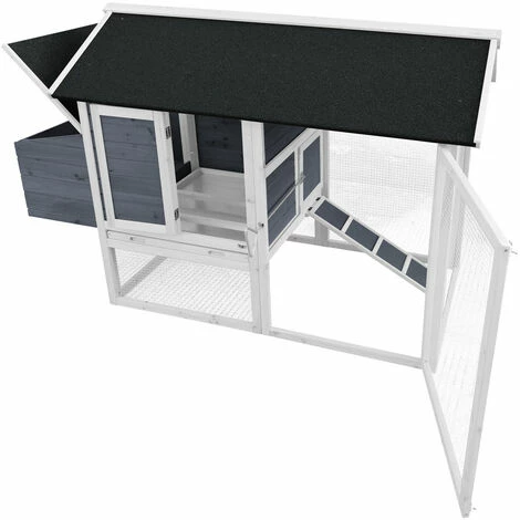 Der Hühnerstall ist aus Fichtenholz gefertigt und hat ein Außenmaß von 171 x 80 x 110 cm. Das integrierte Schlafhaus bietet eine Sitzstange und das gut abgedichtete Holzdach ist mit Bitumen isoliert, sodass die komplette Hühnerstallanlage vor Regen geschützt ist. Eine einfache und hygienische Reinigung wird durch die Kotwanne aus verzinktem Blech ermöglicht, welche herausgezogen werden kann. Eine rutschsichere Rampe verbindet den Freilaufbereich mit dem Häuschen. Damit alle Bereiche des Stalls zur Reinigung oder Nistkontrolle erreicht werden können, verfügt der Nistkasten über ein aufklappbares Dach und der Stall sowie der Freilauf sind jeweils mit einer Tür ausgestattet.