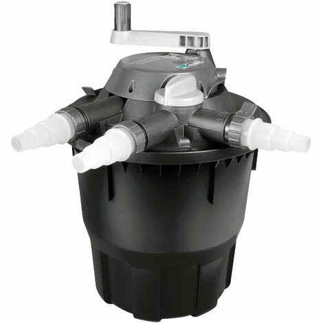 Aufgrund seiner leistungsstarken UVC-Lampe garantiert Hozelock Cyprio bei richtiger Teichgröße klares Wasser. Der Bioforce-Filter kann an der Seite des Teichs versteckt oder bis zur Höhe seiner Wasserzuleitung eingegraben werden. Die Aquaforce-Filterpumpe saugt das schmutzige Wasser aus dem Teich an und pumpt es nach oben zum Bioforce-Filter. Im Bioforce-Filter werden die Schmutzpartikel von den Schaumstoffwürfeln herausgefiltert. Gleichzeitig reinigen Kaldnes-Biomedien das Wasser, und die 18 Watt UVC Lampe beseitigt grünes Wasser. Klares und gesundes Wasser tritt aus dem Bioforce-Druckteichfilter aus und kann an einen höheren Ausspeisepunkt gepumpt werden. So lassen sich schöne Wasserfälle erzeugen.