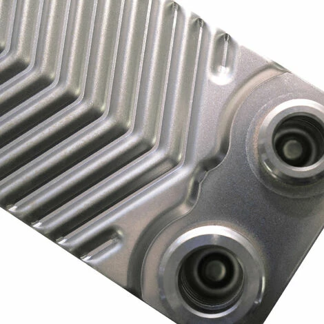 Gelötete Edelstahl Plattenwärmetauscher bestehen aus geprägten Edelstahlplatten, die mit Kupfer im Vakuumverfahren verlötet werden. Beim Zusammenfügen wird jede zweite Platte um 180 Grad in der Ebene gedreht, wodurch sich zwei voneinander gedrehte Strömungsräume bilden, in denen die an der Wärmeübertragung beteiligten Medien im Gegenstrom geführt werden. Die Prägung der Platten erzeugt einen hochturbulenten Durchfluss. Dies ermöglicht eine sehr effektive Wärmeübertragung schon bei geringen Volumenströmen.