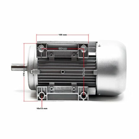 | Abmessungen | Wellenlänge: 48 mm Durchmesser Welle: 19 mm Lochabstand: 145 x 125 mm Motorgröße: 330 x 255 x 175 mm Kabeldurchführung: Ø 16.5 mm Kabelschuhe: Ø 4 mm |
